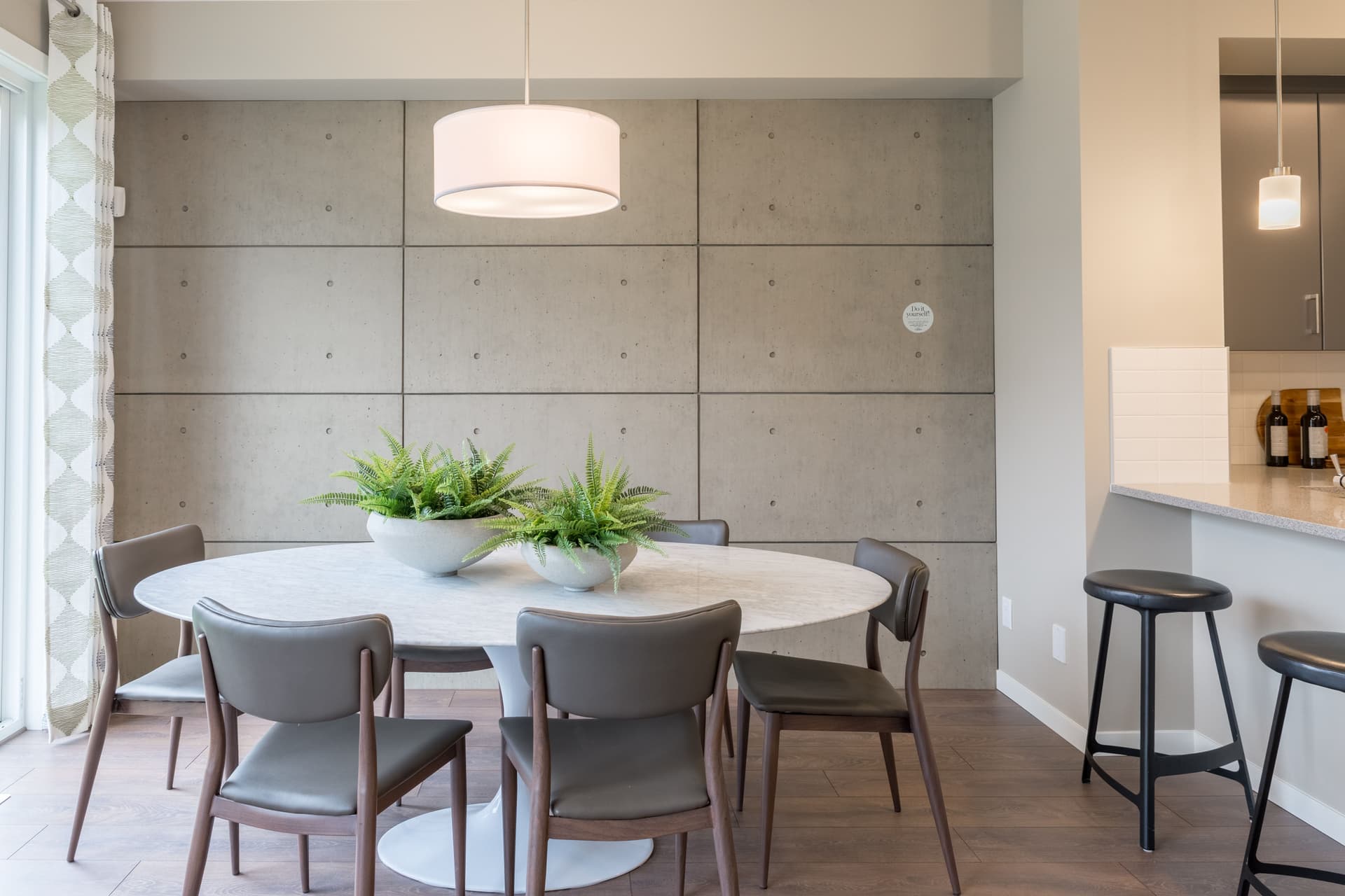 A sleek concrete feature wall sets the tone for new beginnings