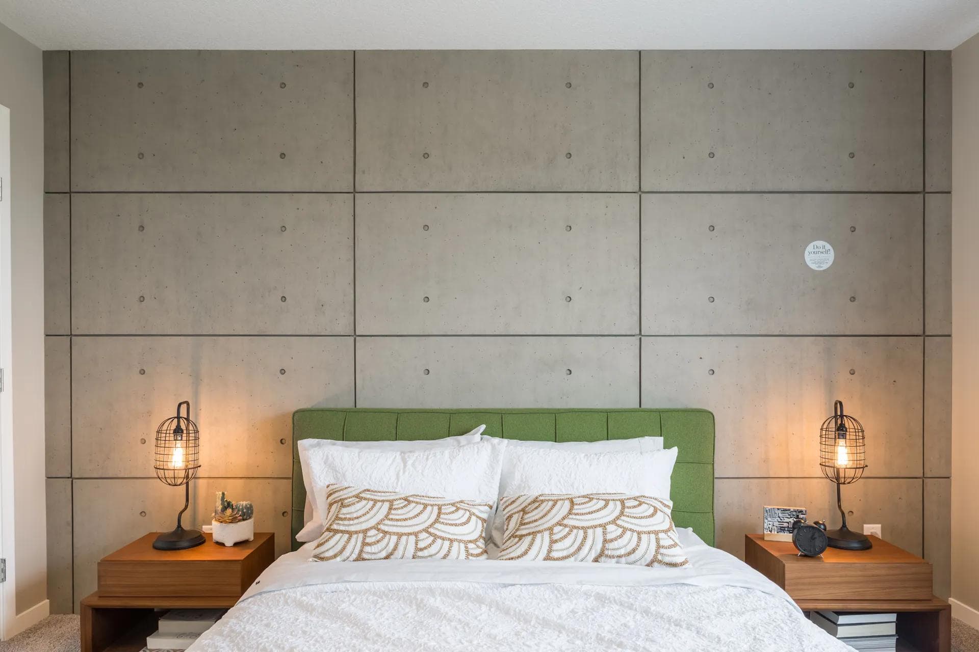 - Choose your feature wall and pick your cladding. There are several concrete panel-type claddings on the market. We used Urban Concrete (www.hourwall.com) in washed grey because of its authentic look, texture and feel.
